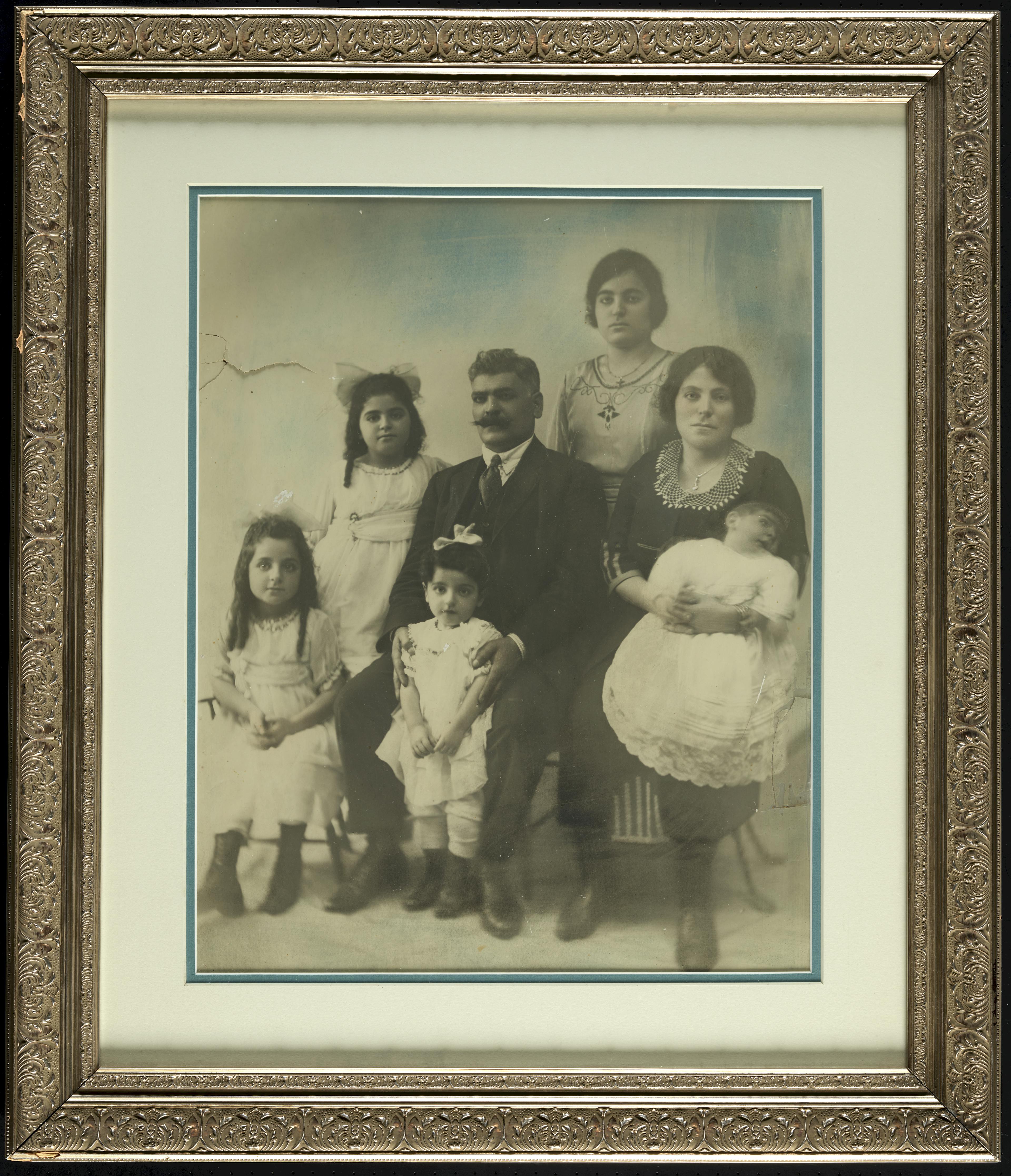 The Assaf family, left to right front: Fahime, Wadia. Second row: Wardé, Georges, Saada holding infant John. Chafika in rear. (Photo courtesy of the Solomon Family, c. 1921)