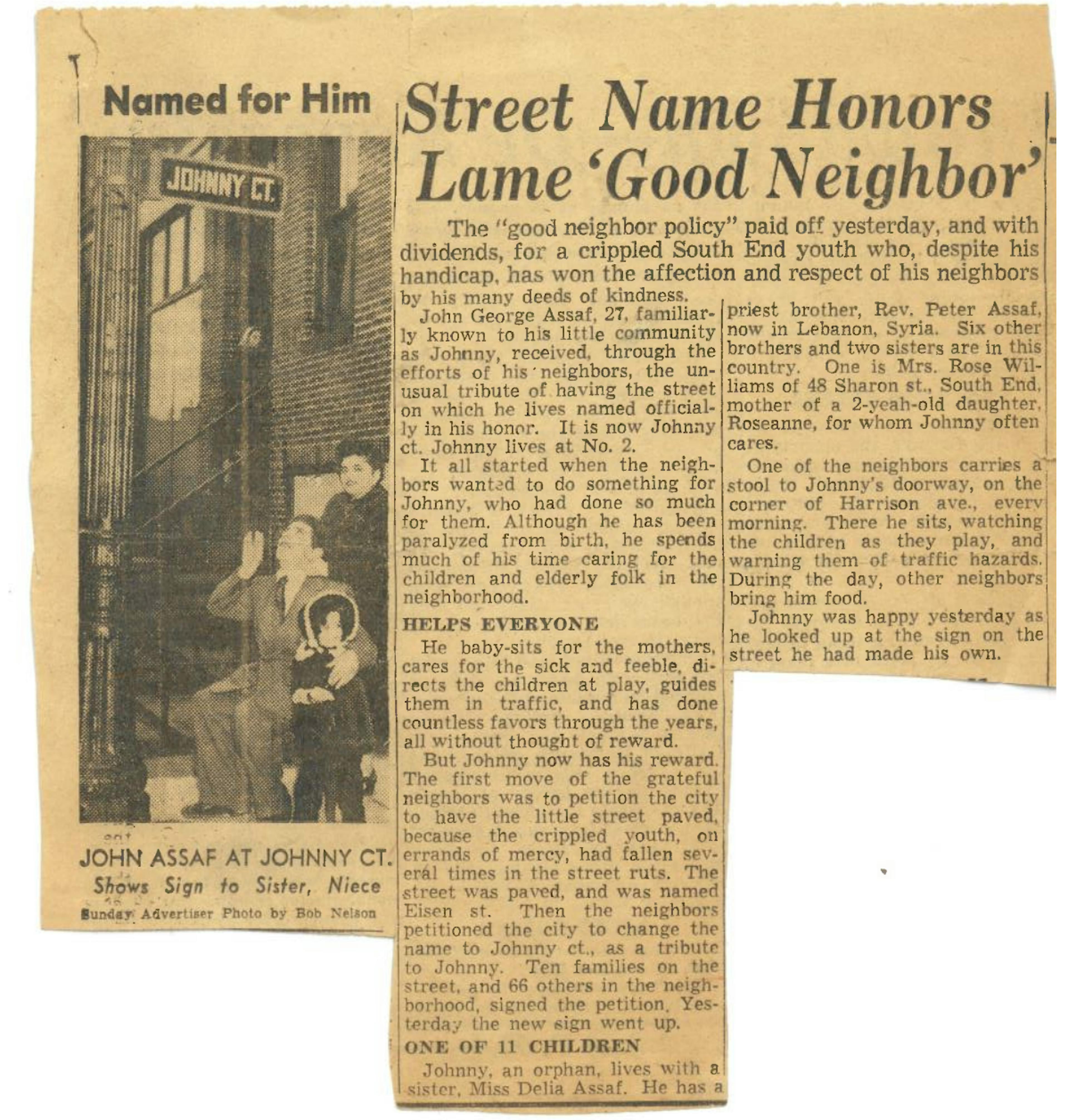 After Johnny moved out in 1956, the people of Maple Place advocated for the street name to be changed to “Johnny Court” in his honor because of the impact he had on the community. John Assaf was not only the face of this street and neighborhood, but his overcoming of his physical challenges also symbolized the resilience that characterized life in the row houses.