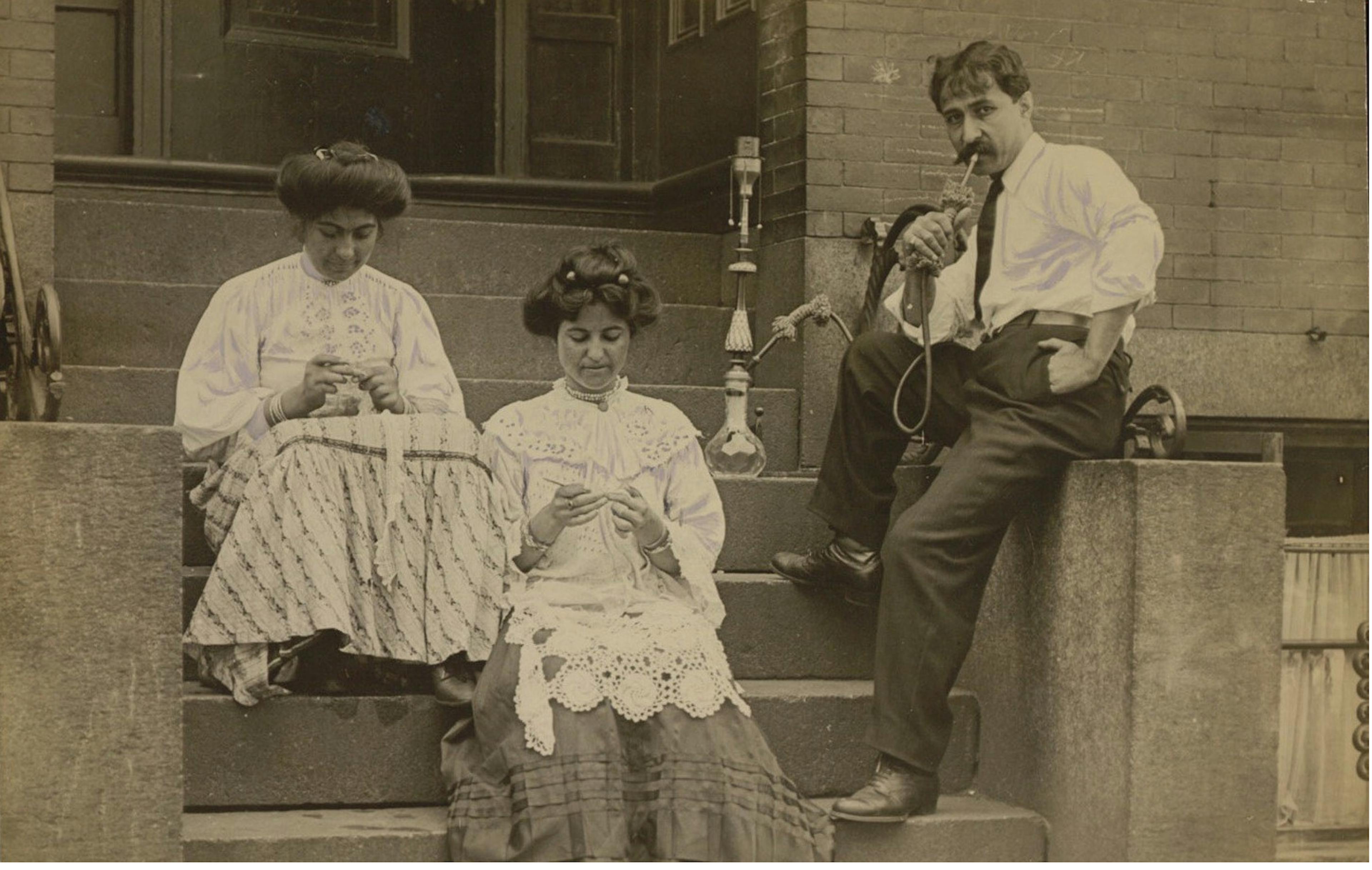 Syrian family sitting on a front step on Hudson Street, 1909. Photographer unknown. (Photo courtesy of Boston Herald, Travel