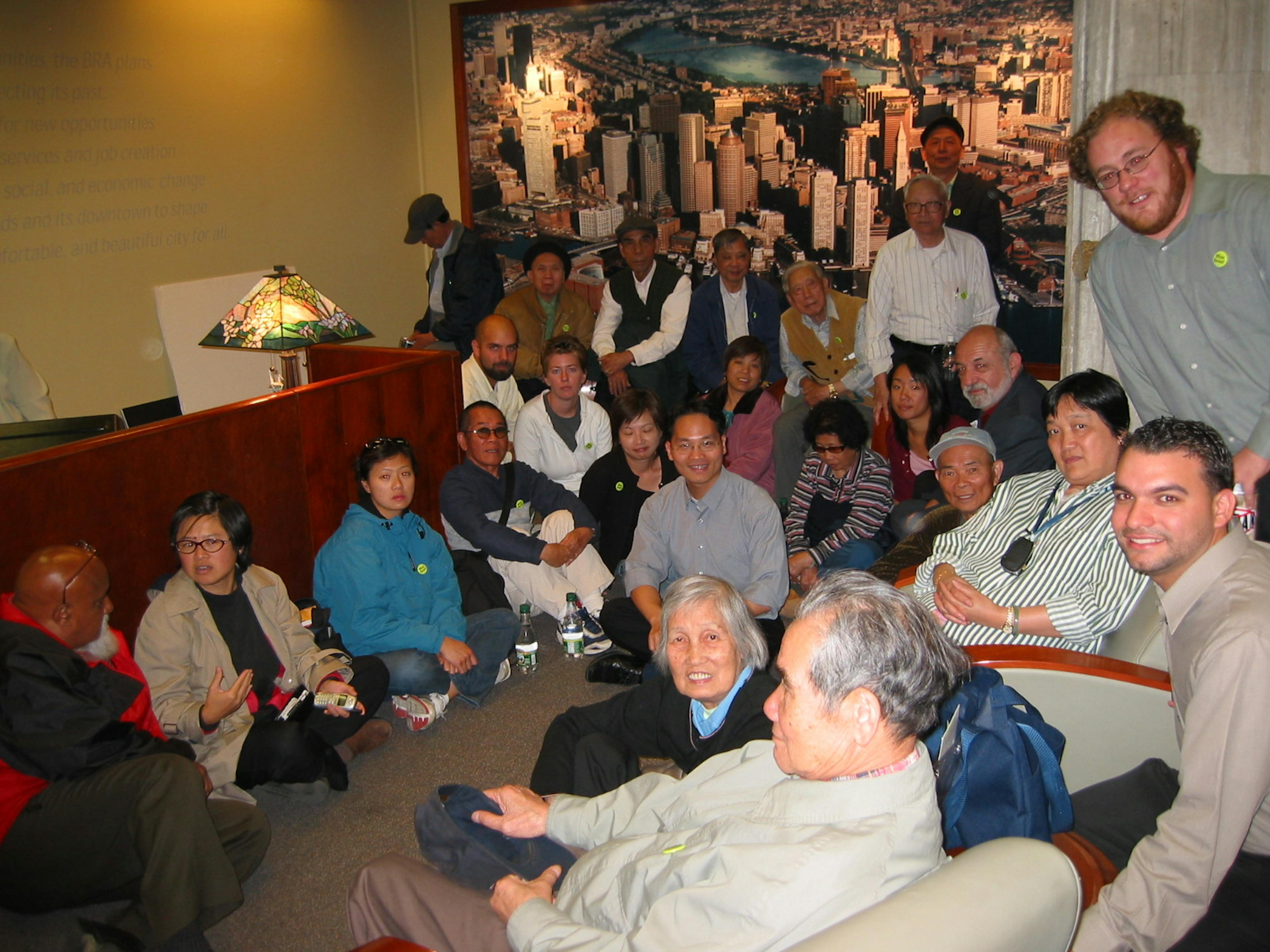 Chinese Progressive Association members stage an impromptu sit-in at the Boston Redevelopment Authority office, supported by City Councilors Chuck Turner and Felix Arroyo, Sr., 2004.